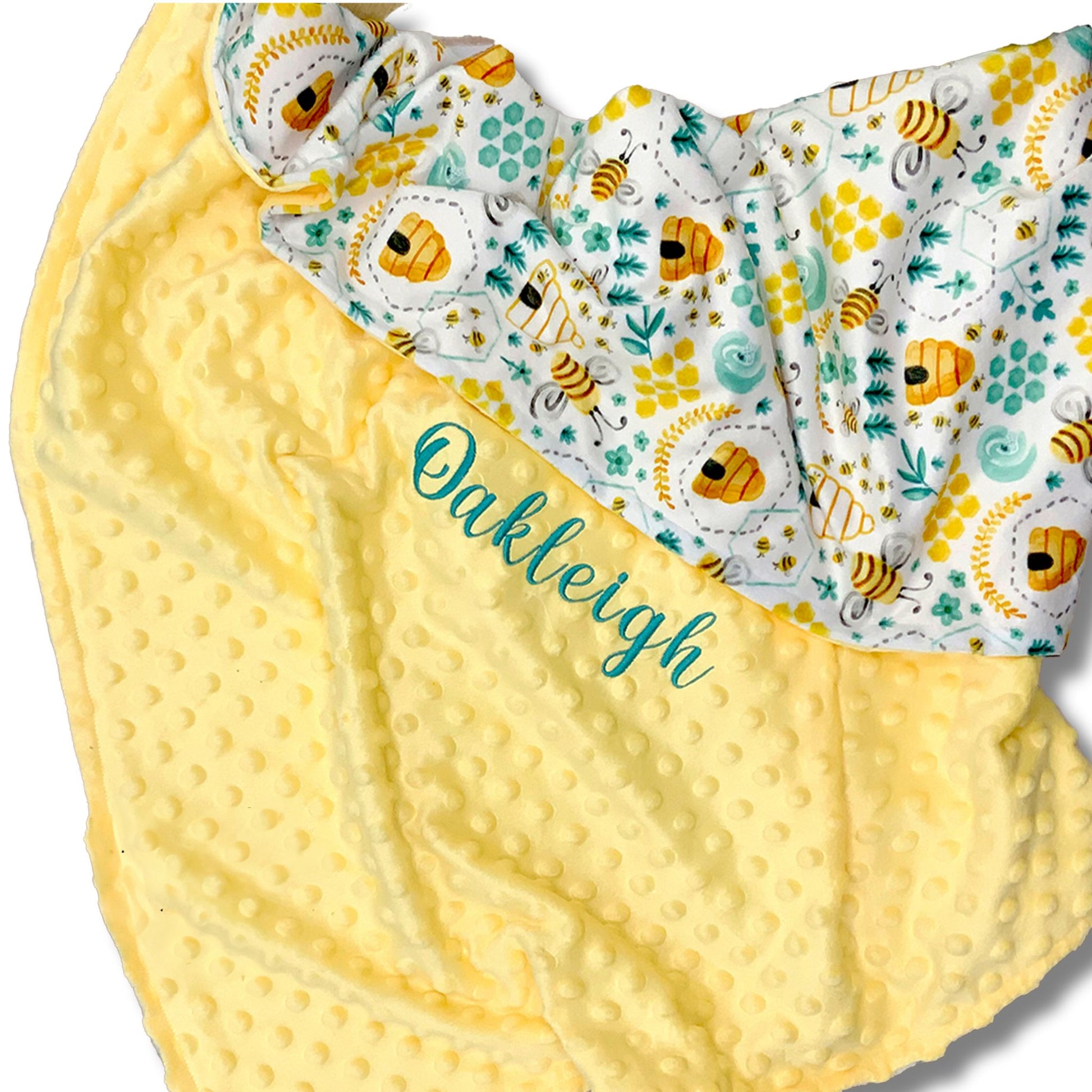 This cute yellow baby blanket has a print with honeybees and hives. Get this double minky Baby Blanket to snuggle your little one. Custom-embroidered with a name of your choice. It's luxuriously soft to the touch and features a matching yellow minky dots on the other side. . Keep your little one warm and cozy in style.
