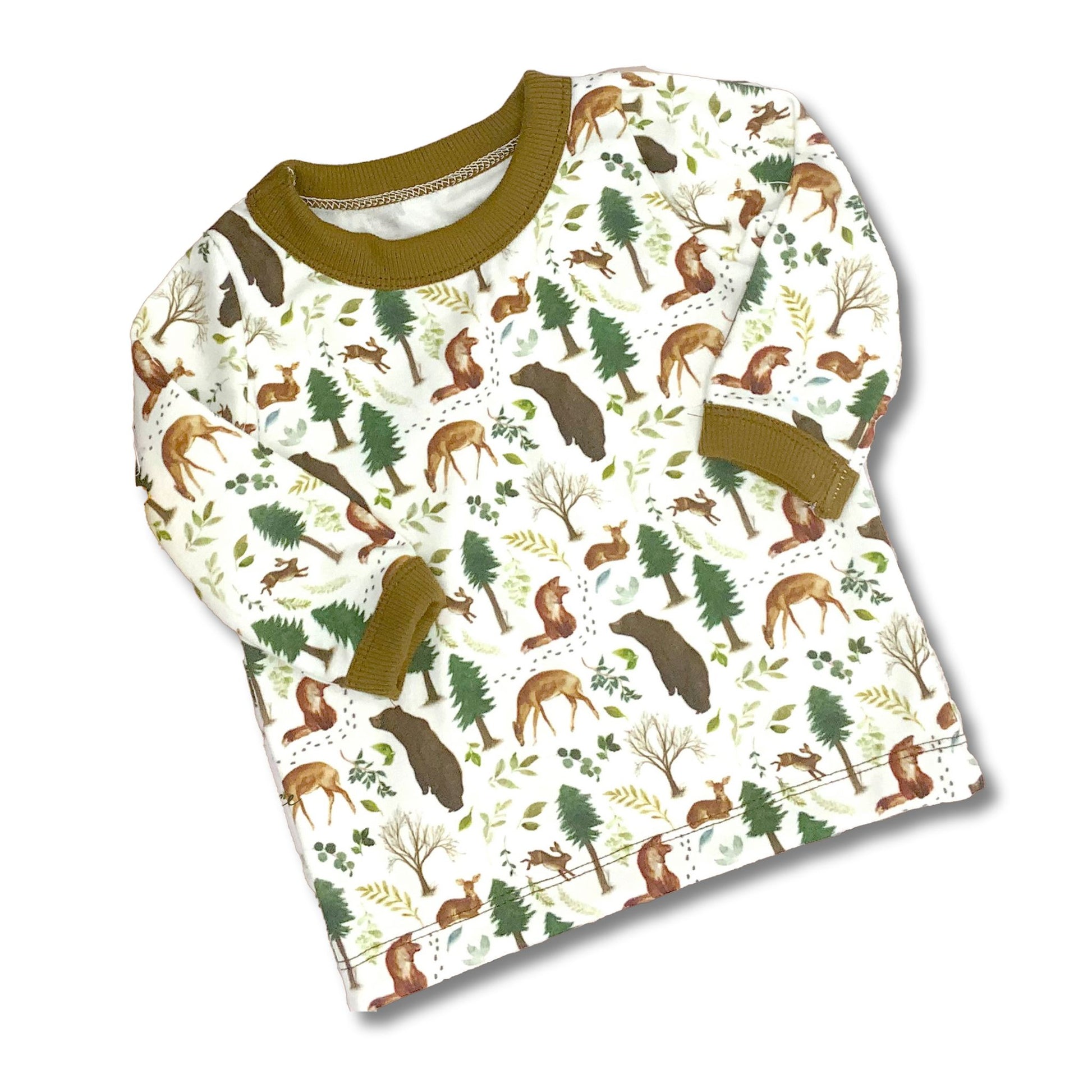 Get this wildlife print long sleeve shirt for those cool fall and winter days. It's made of 100% organic cotton interlock with rib knit neckband and cuffs. This fabric is so soft and easy to care for. Machine washable, tumble dry low and a cool iron as needed.