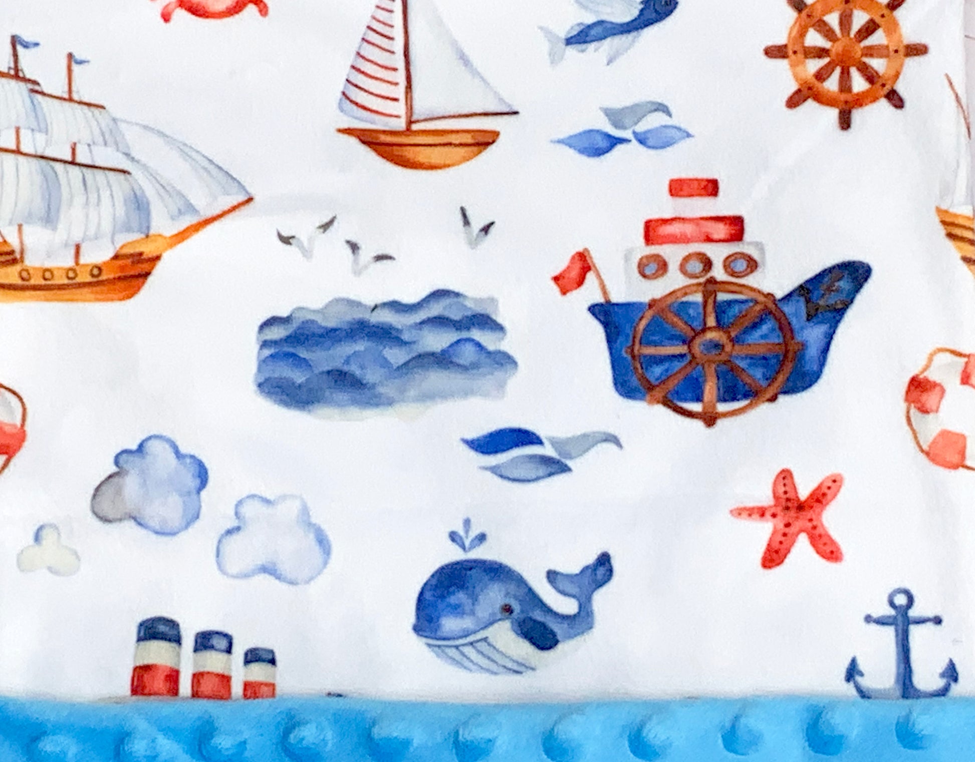 This cute watercolor nautical print has ships, whales and more with a matching blue minky dots. It's perfect for snuggles with your little one. Custom-embroidered with a name of your choice. It's luxuriously soft to the touch and features a matching blue colored minky dots embroidered with your child's name on the other side. . Keep your little one warm and cozy in style.