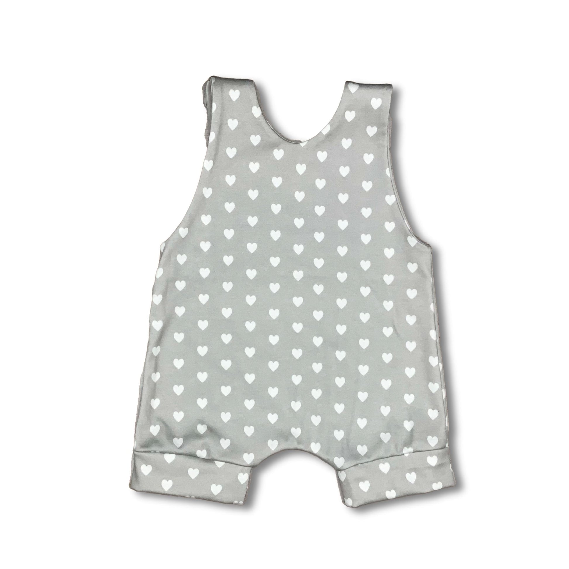 Gray & White Heart Print Summer Romper, 100% Organic Cotton, Ready to Ship