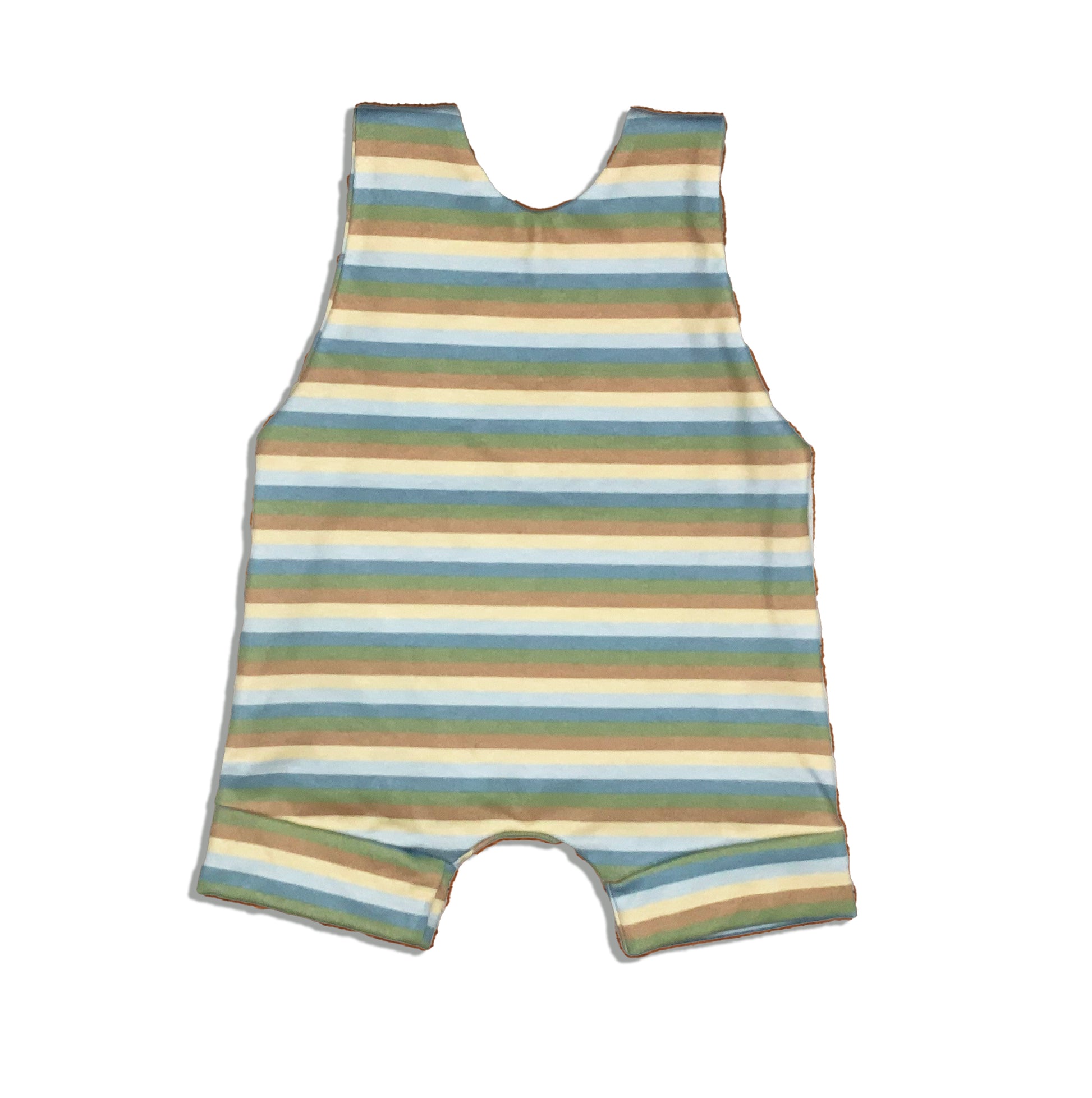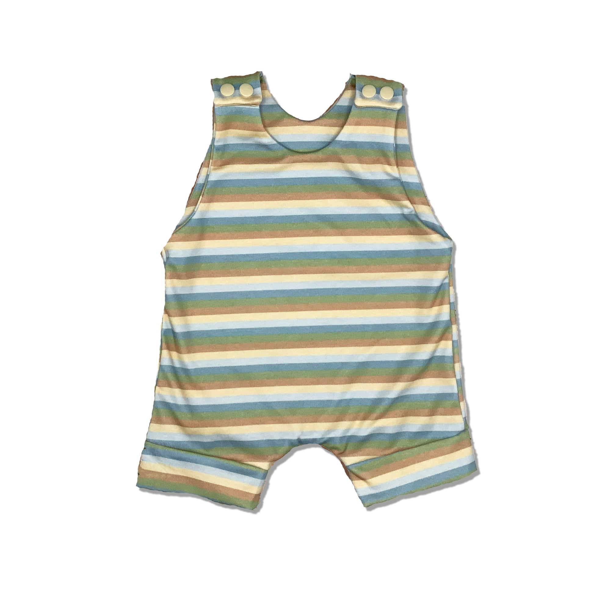 This gender neutral striped romper is perfect for those warm summer days. This short romper is made of 100% organic cotton knit. This outfit is perfect for spring and summer outings. The harem style gives plenty of room for diapers without being tight on the little one.